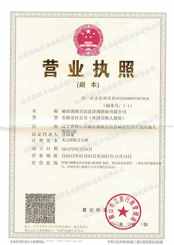 岫巖滿族自治縣津湧酒業(yè)有限公司位于風景秀麗、青山綠水的岫巖縣前營鎮(zhèn),公司占地3500平方米,年生產能力100噸釀造醬香原漿白酒。2013年公司產品“津湧豪酒”曾獲得遼寧省“遼寧放心名酒”稱號,公司現(xiàn)正研發(fā)配制酒生產項目,為公司發(fā)展提供技術保證。公司的注冊資本全部由美籍華人出資。